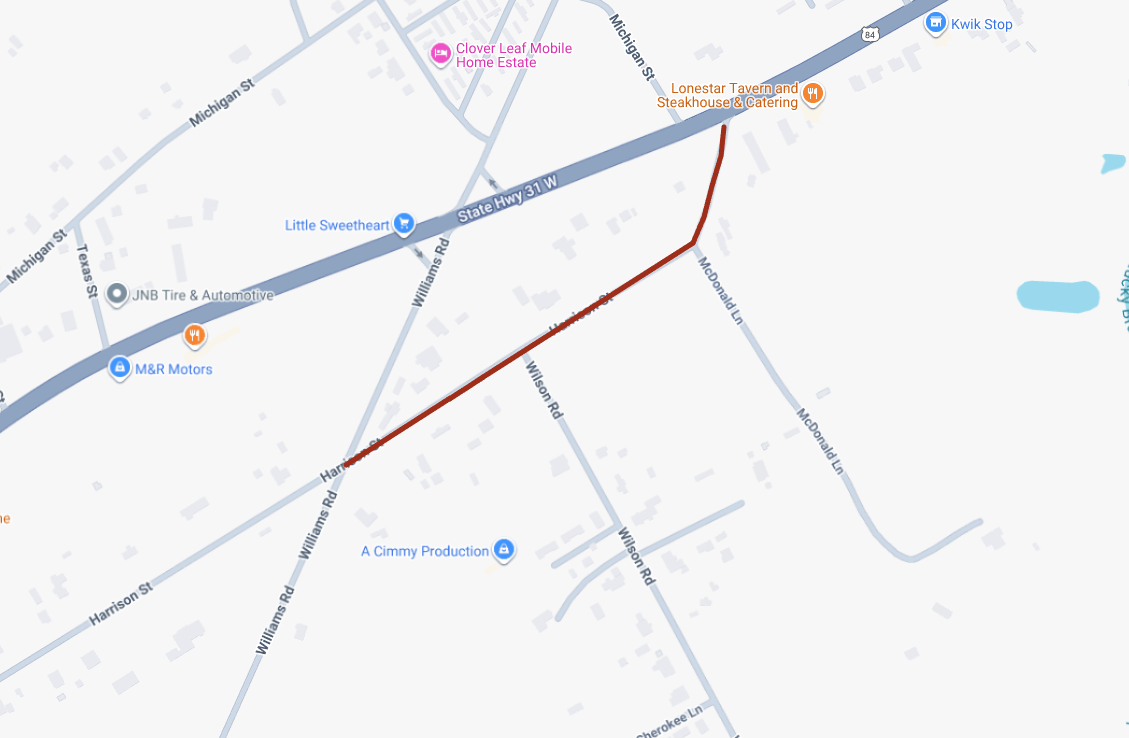 Wednesday, September 24, 2025 from 8am to 4pm- Circle T contractors will have a road closure on Harrison St. between Williams Rs and State HWY 31 West while they repair a manhole in the street.